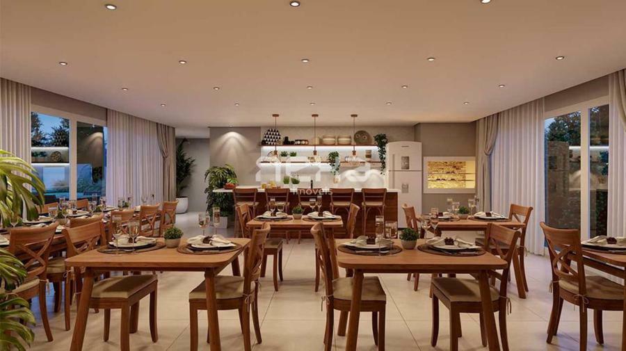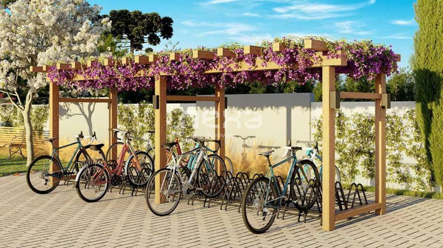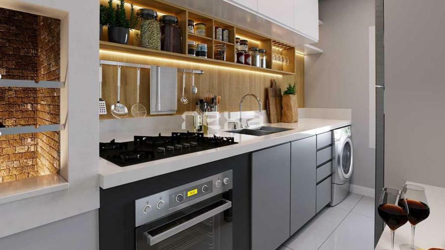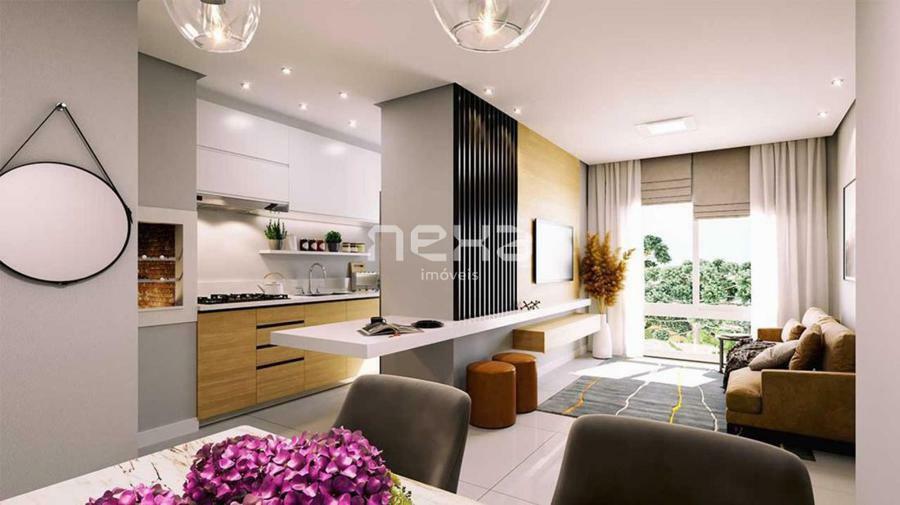 Apartamentos de um e de dois dormitórios, cozinha americana com churrasqueira, sala de estar, banho social, espera para ar condicionado, espera para água quente, tomadas USB aleatórias nas suítes e sala, esquadrias em PVC e uma vaga de garagem.