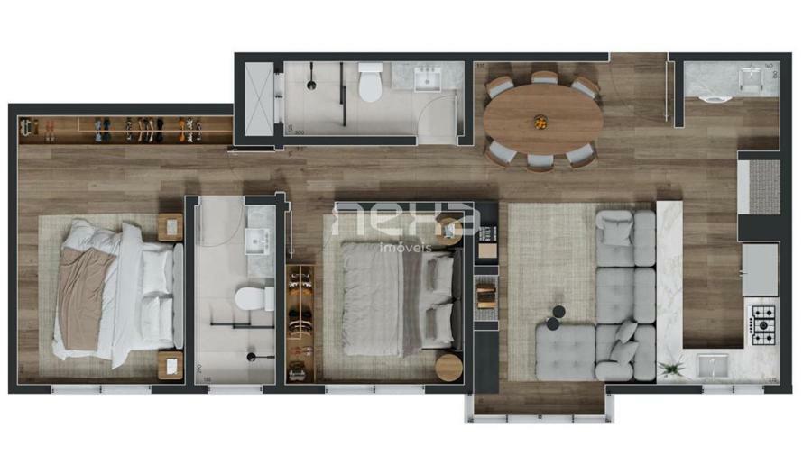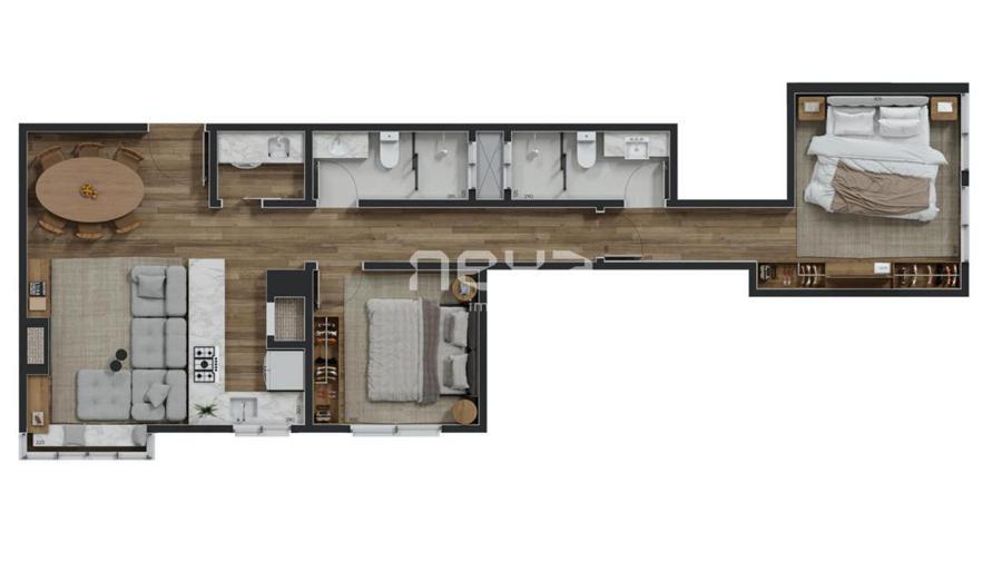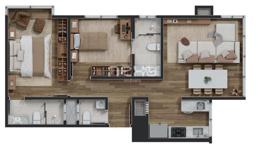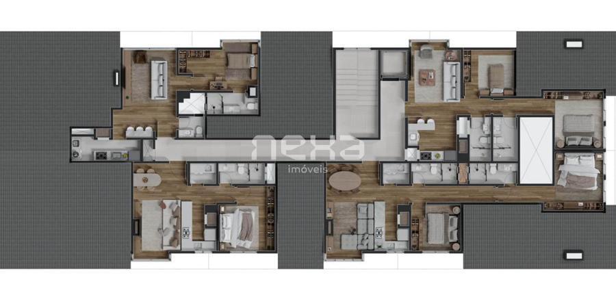 Esquadrias em PVC com vidros duplos, pisos porcelanato e vinílico, espera para ar condicionado, calefação e automação residencial.
