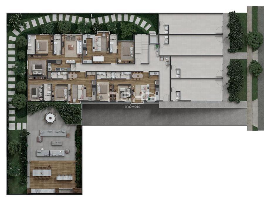 Conta com sala de estar, jantar, cozinha, lavanderia, hall de entrada e todos com uma vaga de garagem.