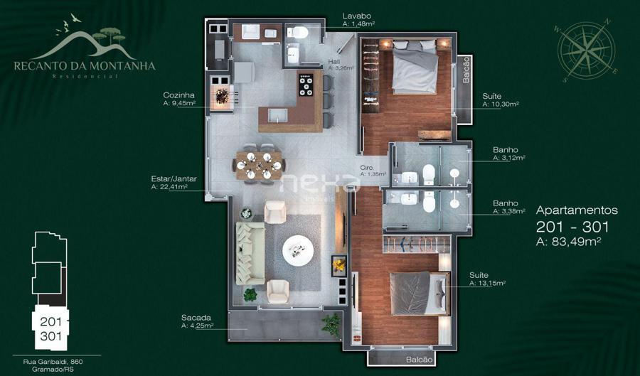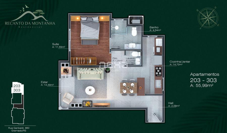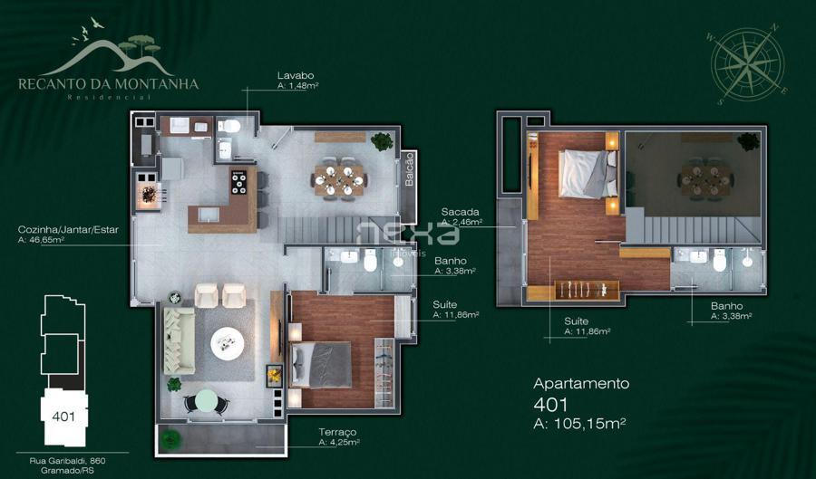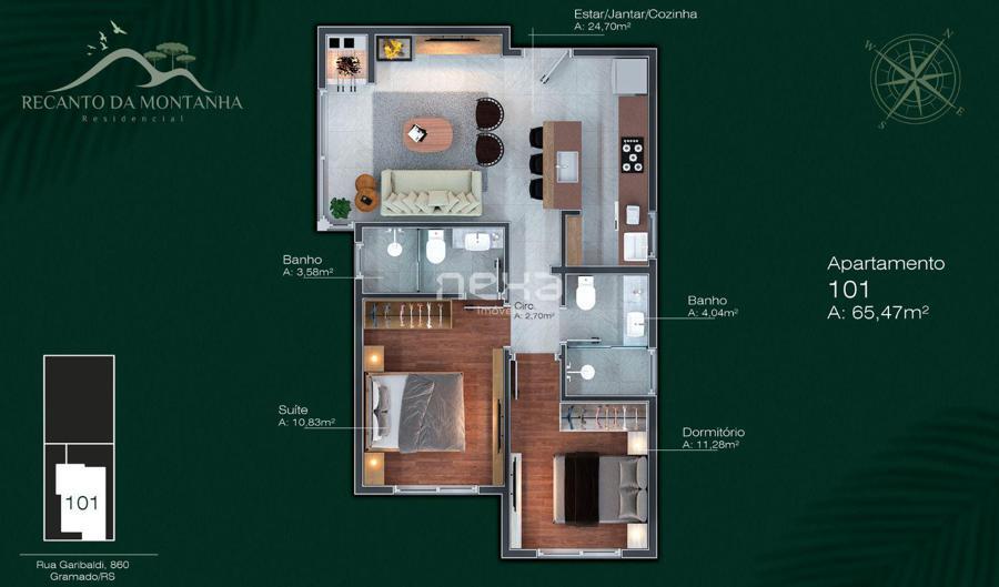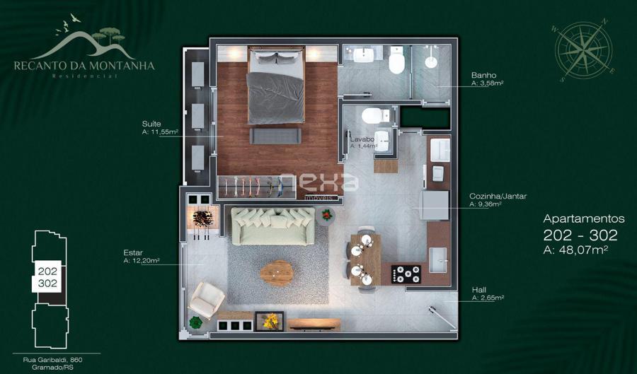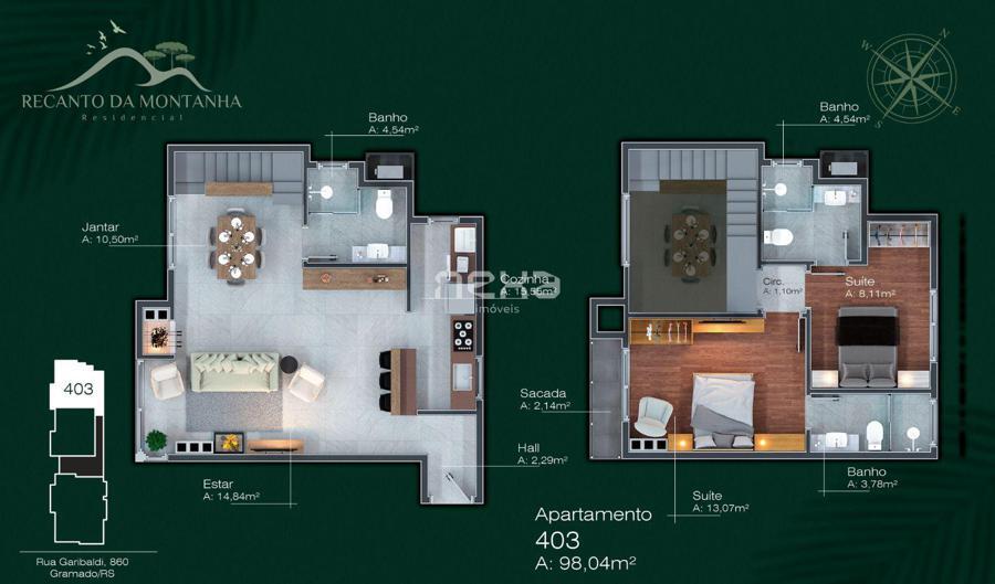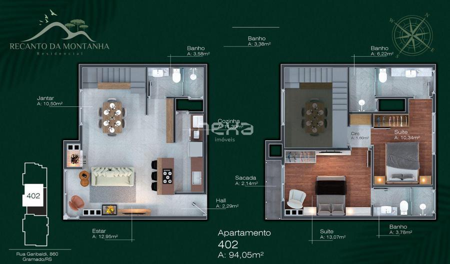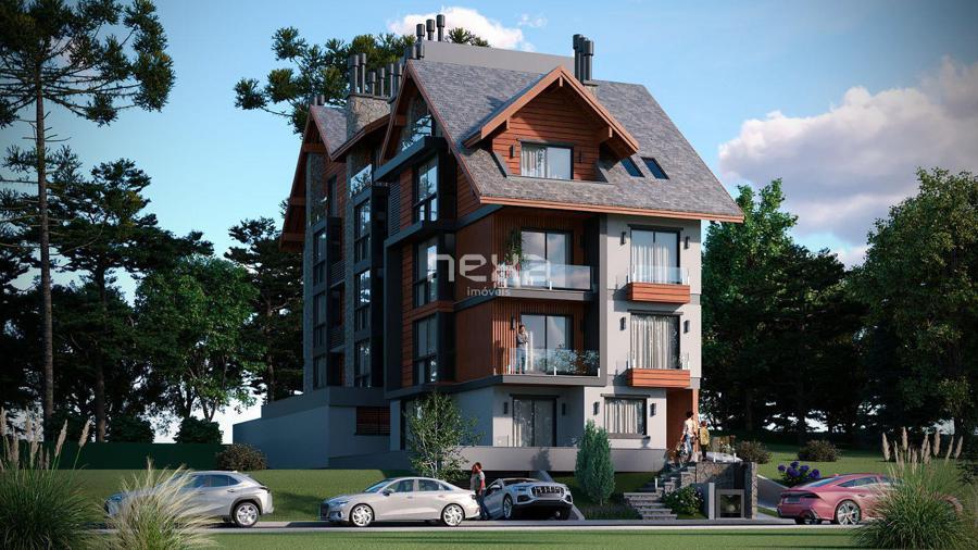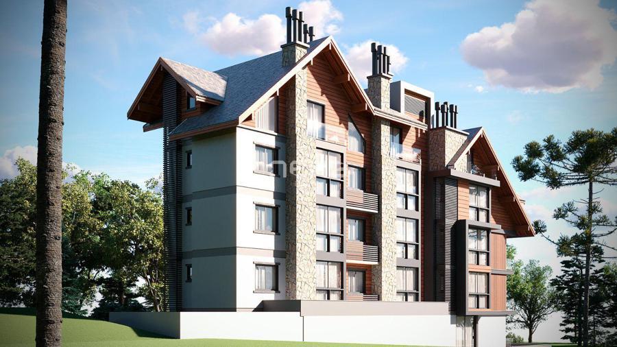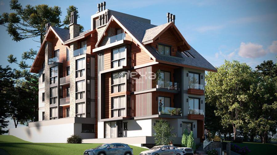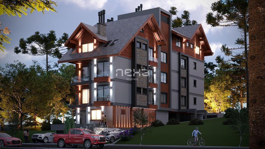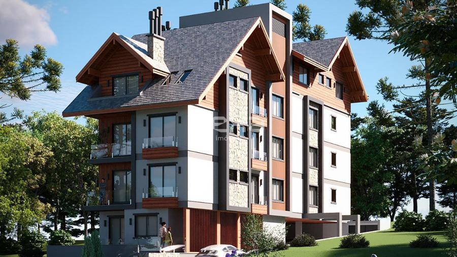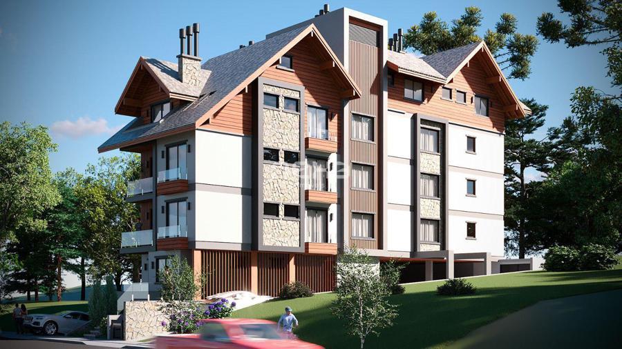 Em meio a natureza, conheça o Residencial Recanto da Montanha!! Localizado no Centro de Gramado/RS, á 480m da Rua Coberta, no coração da cidade! Constituído por 09 unidades compostas de 01 ou 02 suítes e 01 unidade composta de 01 suíte + 01 dormitório. Todos os apartamentos contam com lavabo, cozinha integrada com área de serviço e churrasqueira, living com lareira, esquadrias pretas em PVC com vidros duplos, rebaixo em gesso, massa corrida nas paredes, piso vinílico e porcelanato. O Prédio terá elevador, elevador externo para acessibilidade, Hall de entrada decorado e 10 box de garagem com depósito.
