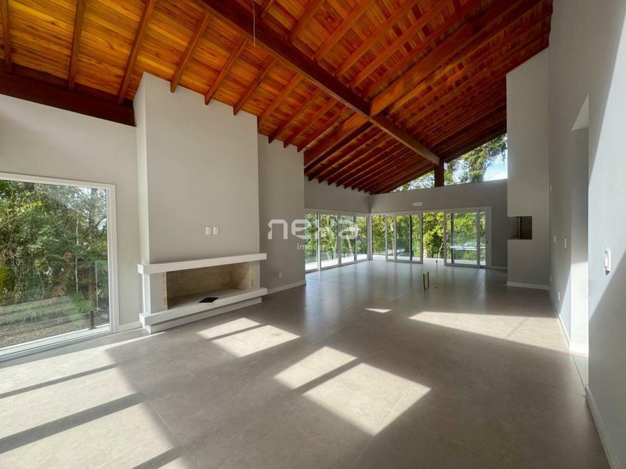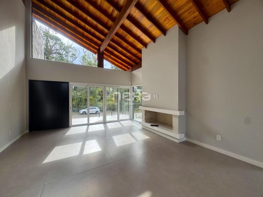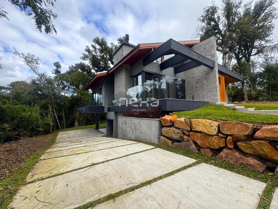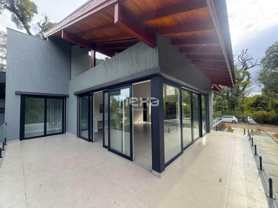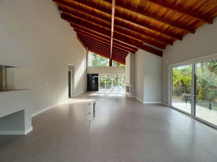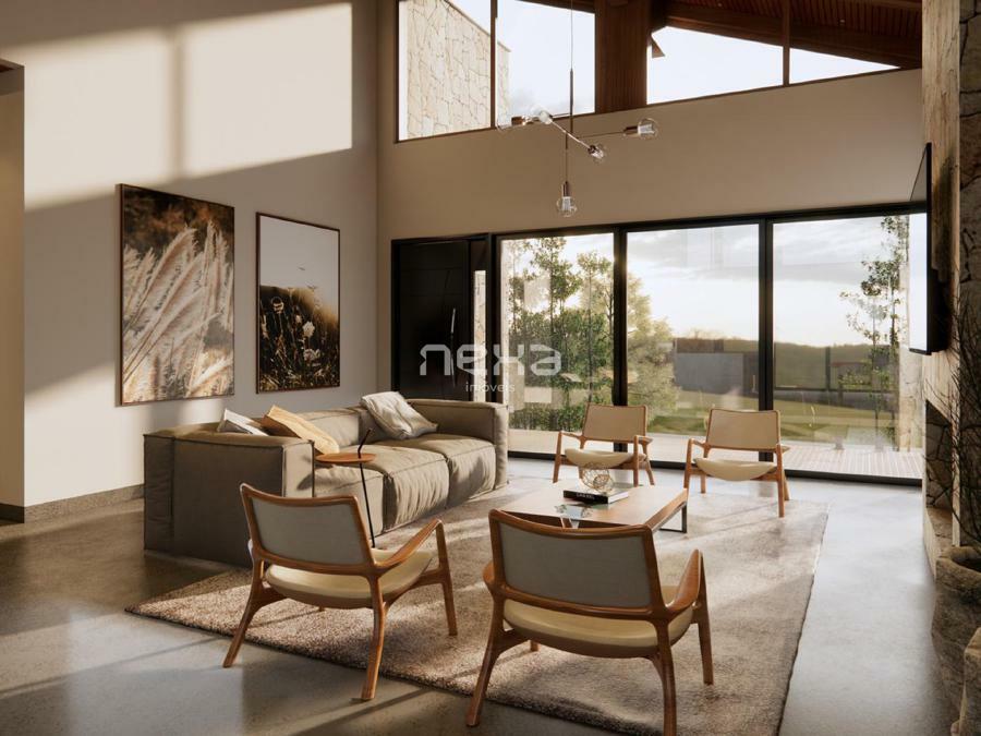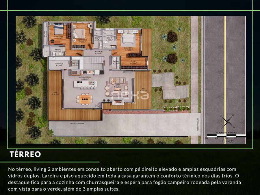 No térreo, living 2 ambientes em conceito aberto com pé direito elevado e amplas esquadrias com vidros duplos. Lareira e piso aquecido em toda a casa garantem o conforto térmico nos dias frios. O destaque fica para a cozinha com churrasqueira e espera para fogão campeiro rodeada pela varanda com vista para o verde, além de 3 amplas suítes.