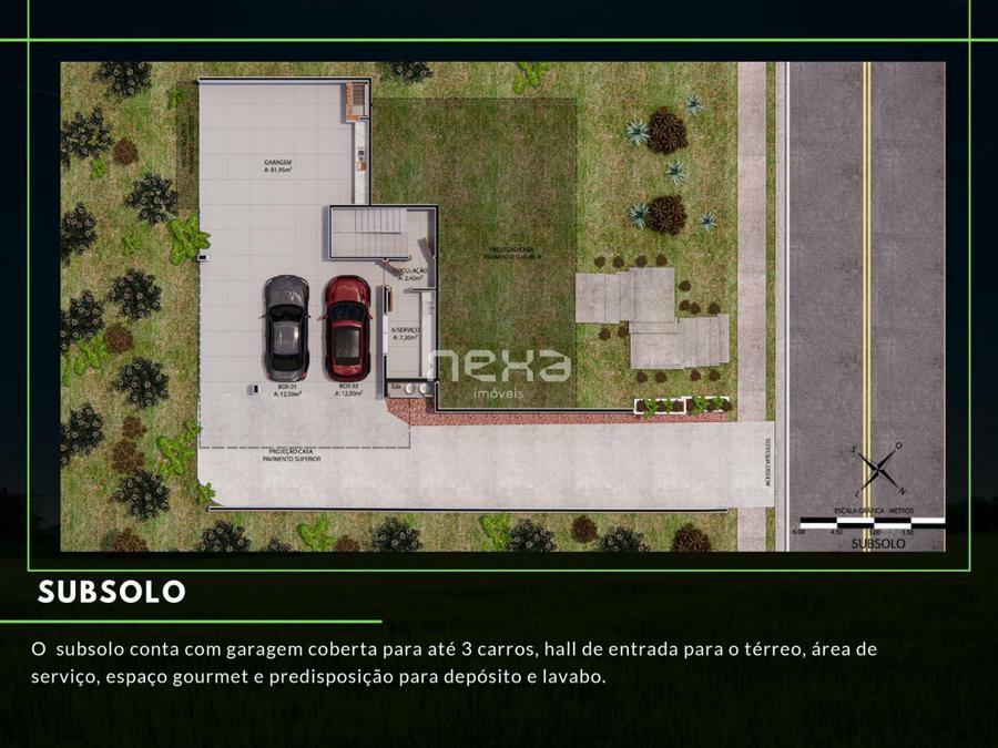 O subsolo conta com garagem coberta para até 3 carros, hall de entrada para o térreo, área de serviço, espaço gourmet e predisposição para depósito e lavabo.