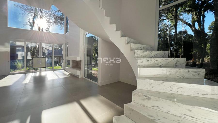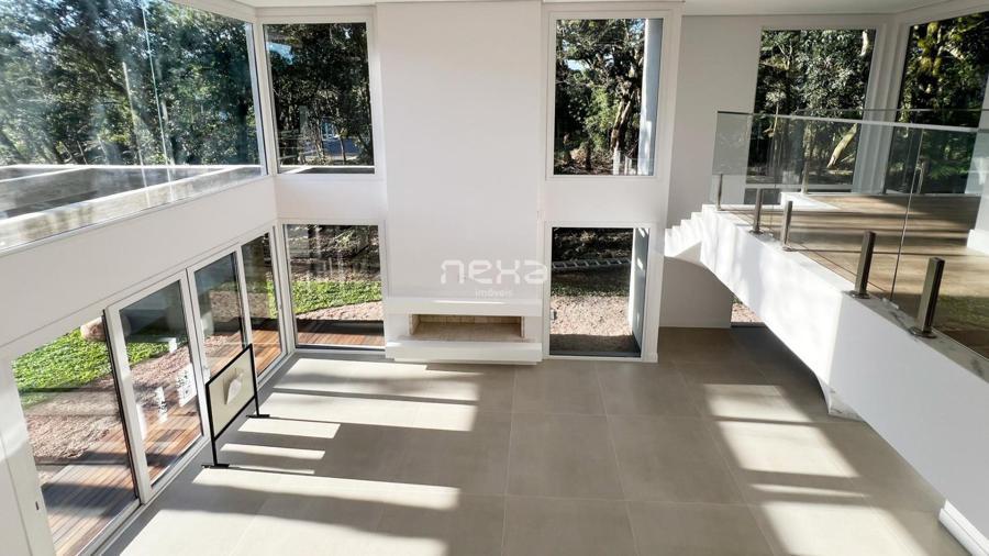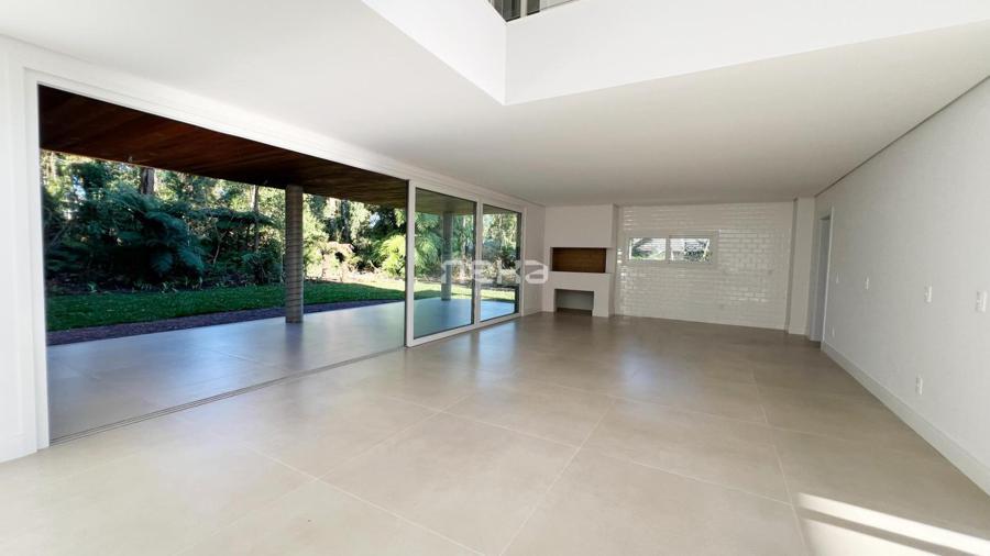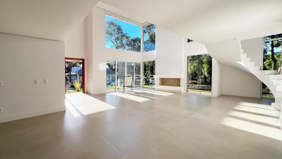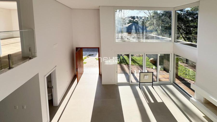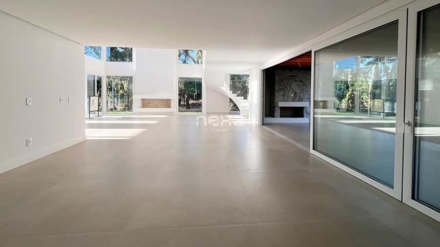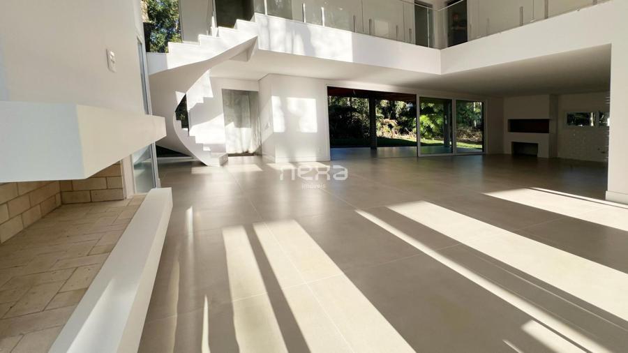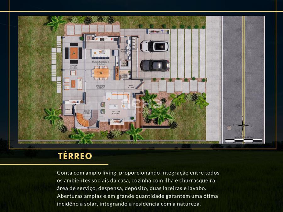 Térreo: Conta com amplo living, proporcionando integração entre todos os ambientes sociais da casa, cozinha com ilha e churrasqueira, área de serviço, despensa, depósito, duas lareiras e lavabo. Aberturas amplas e em grande quantidade garantem uma ótima incidência solar, integrando a residência com a natureza.