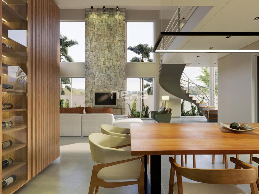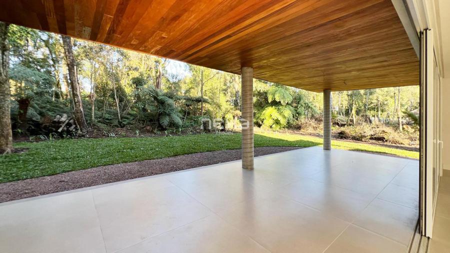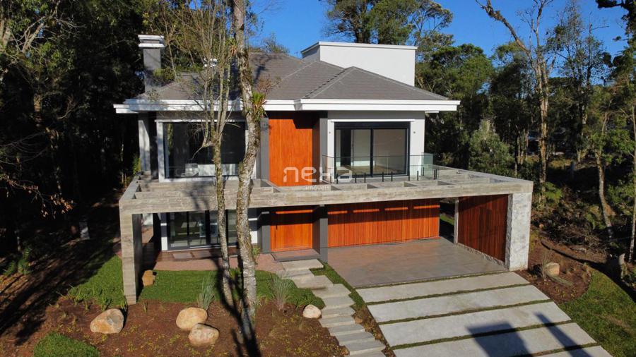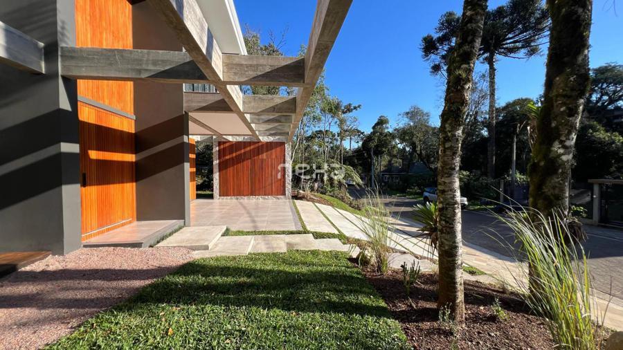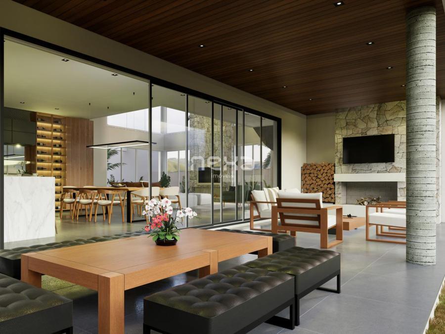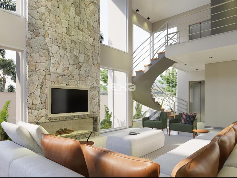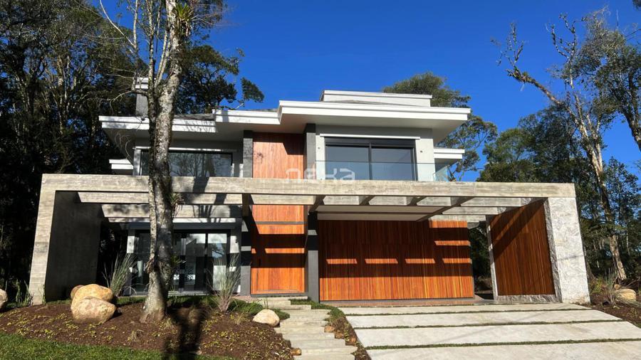 Térreo: Conta com amplo living, proporcionando integração entre todos os ambientes sociais da casa, cozinha com ilha e churrasqueira, área de serviço, despensa, depósito, duas lareiras e lavabo. Aberturas amplas e em grande quantidade garantem uma ótima incidência solar, integrando a residência com a natureza.