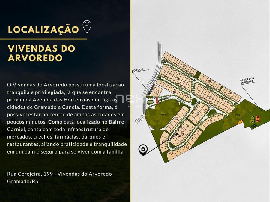O Vivendas do Arvoredo possui uma localização tranquila e privilegiada, já que se encontra próximo à Avenida das Hortênsias que liga as cidades de Gramado e Canela. Desta forma, é possível estar no centro de ambas as cidades em poucos minutos. Como está localizado no Bairro Carniel, conta com toda infraestrutura de mercados, creches, farmácias, parques e restaurantes, aliando praticidade e tranquilidade em um bairro seguro para se viver com a família.