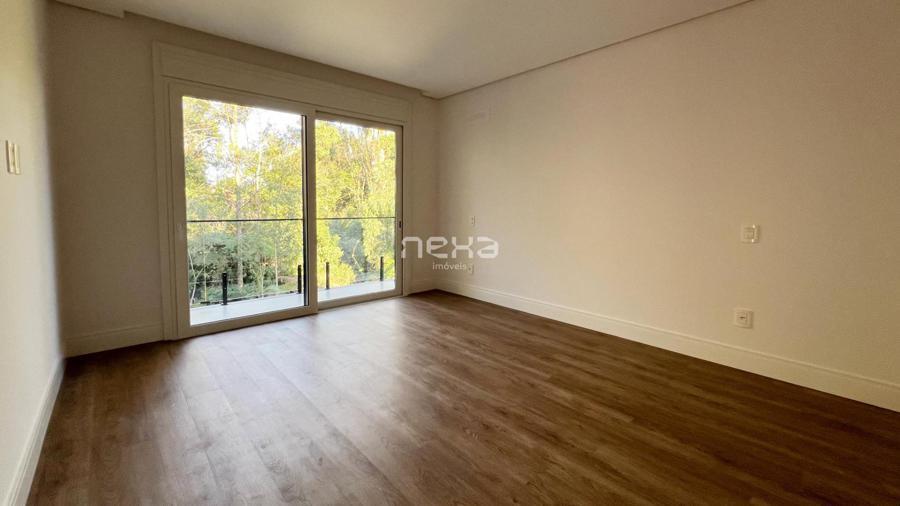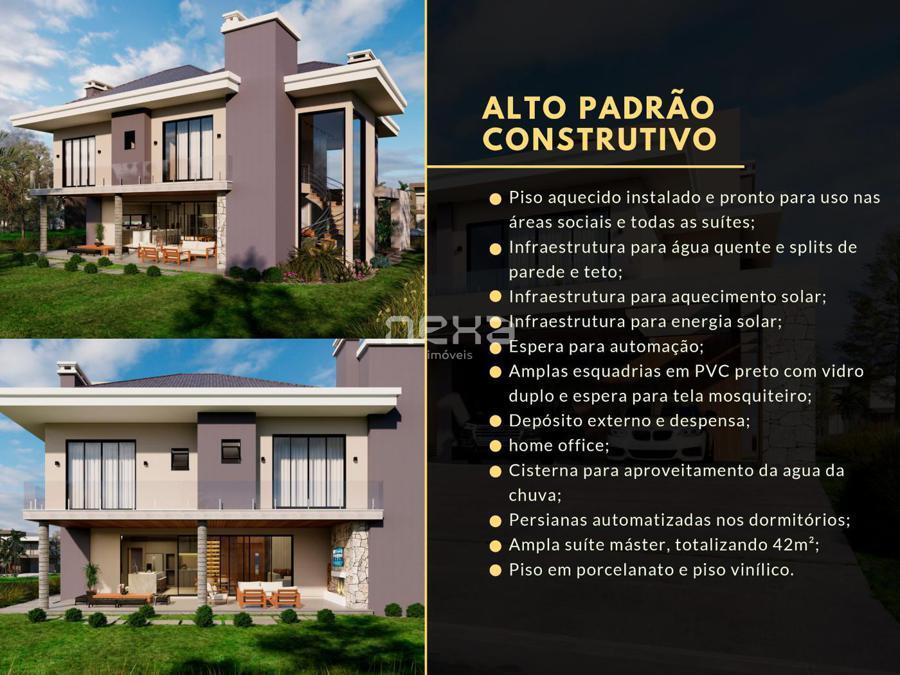 Piso aquecido instalado e pronto para uso nas áreas sociais e todas as suítes; Infraestrutura para água quente e splits de parede e teto; Infraestrutura para aquecimento solar; Infraestrutura para energia solar; Espera para automação; Amplas esquadrias em PVC preto com vidro duplo e espera para tela mosquiteiro; Depósito externo e despensa; home office; Cisterna para aproveitamento da agua da chuva; Persianas automatizadas nos dormitórios; Ampla suíte máster, totalizando 42m²; Piso em porcelanato e piso vinílico.