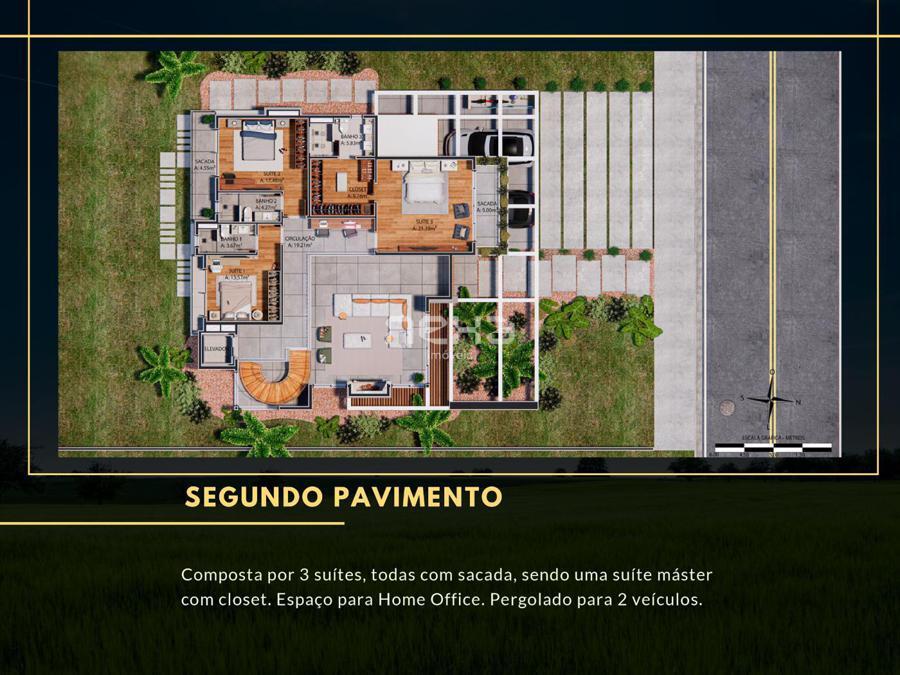 Segundo pavimento: Composta por 3 suítes, todas com sacada, sendo uma suíte máster com closet. Espaço para Home Office. Pergolado para 2 veículos.