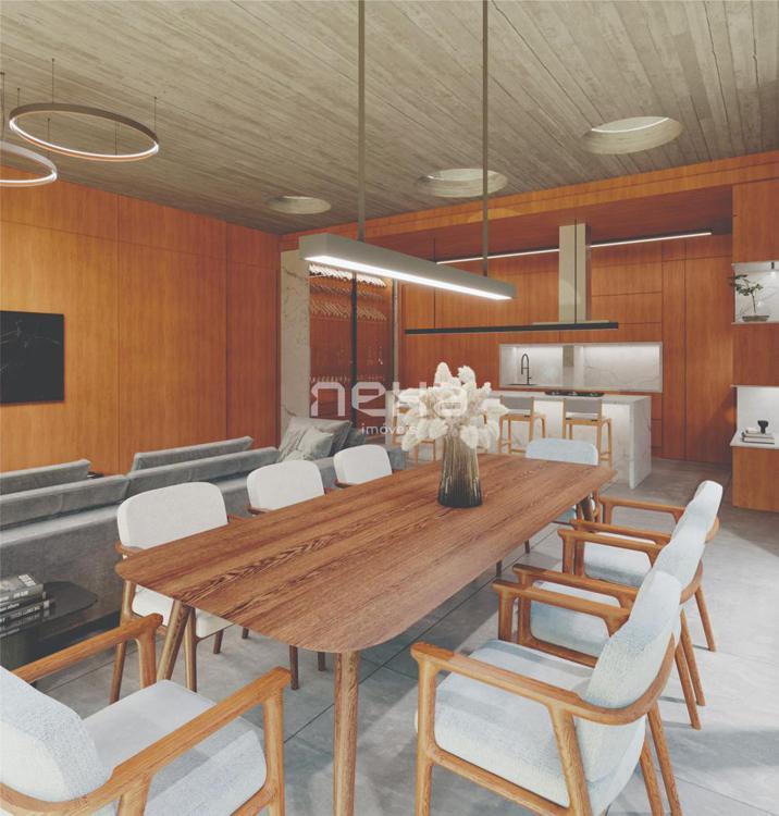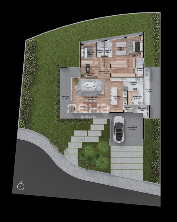 A casa possui 258m2 distribuídos em 3 suítes, escritório, salas de estar jantar e gourmet, além da cozinha e lavanderia ligadas a uma varanda de serviços, assim como garagem para dois carros e um amplo depósito.