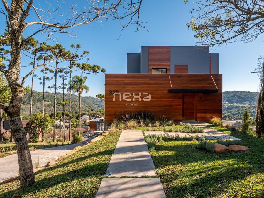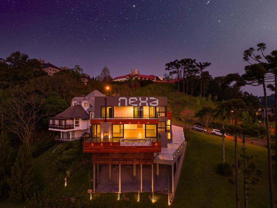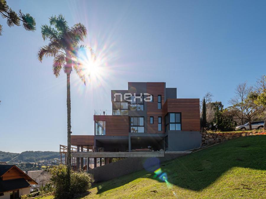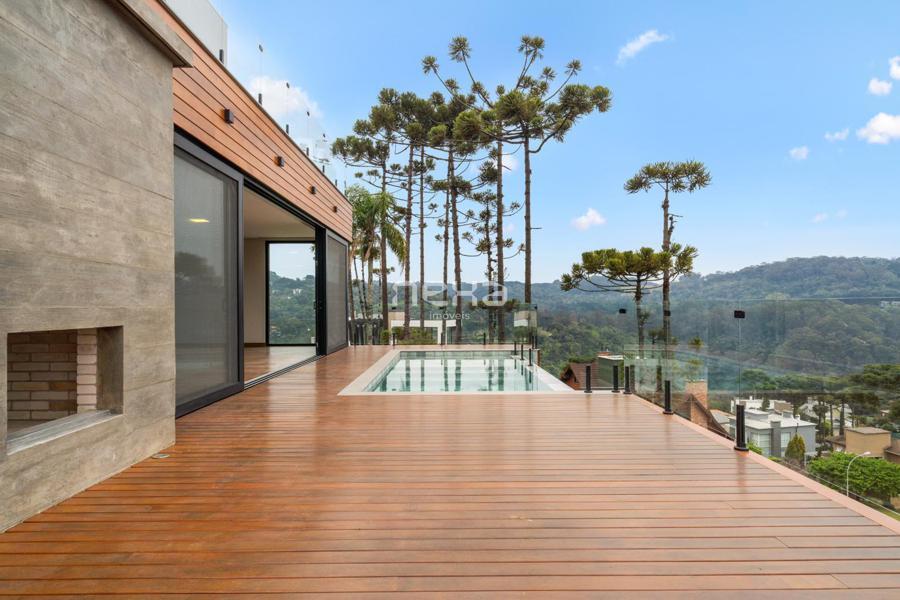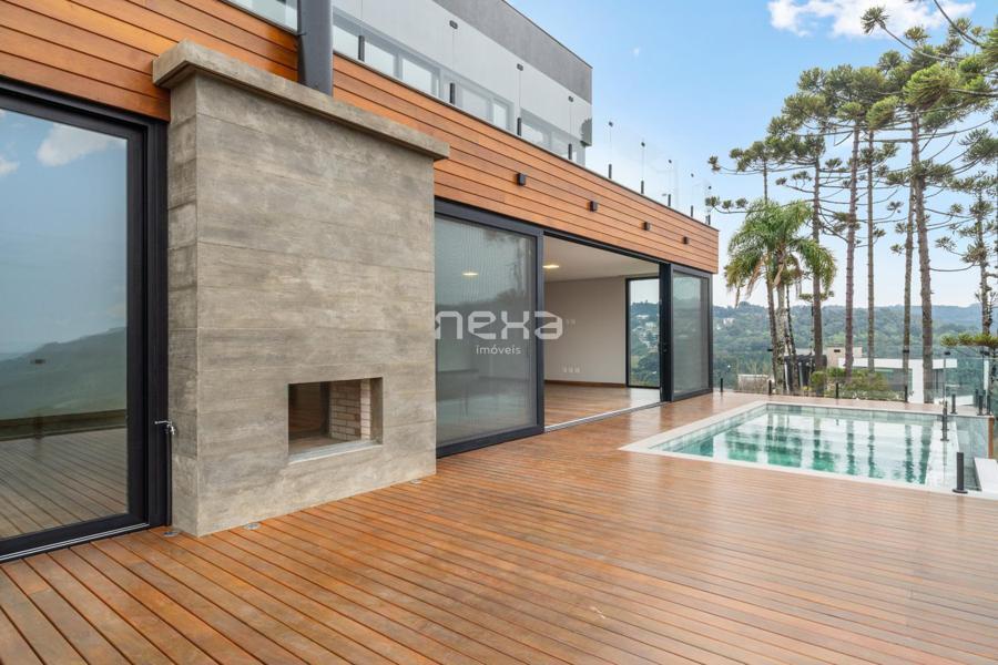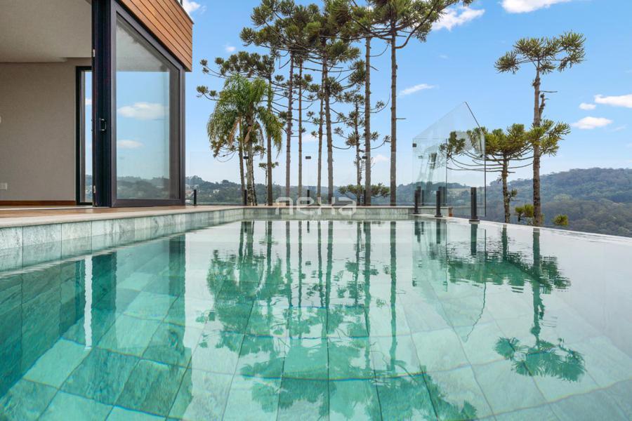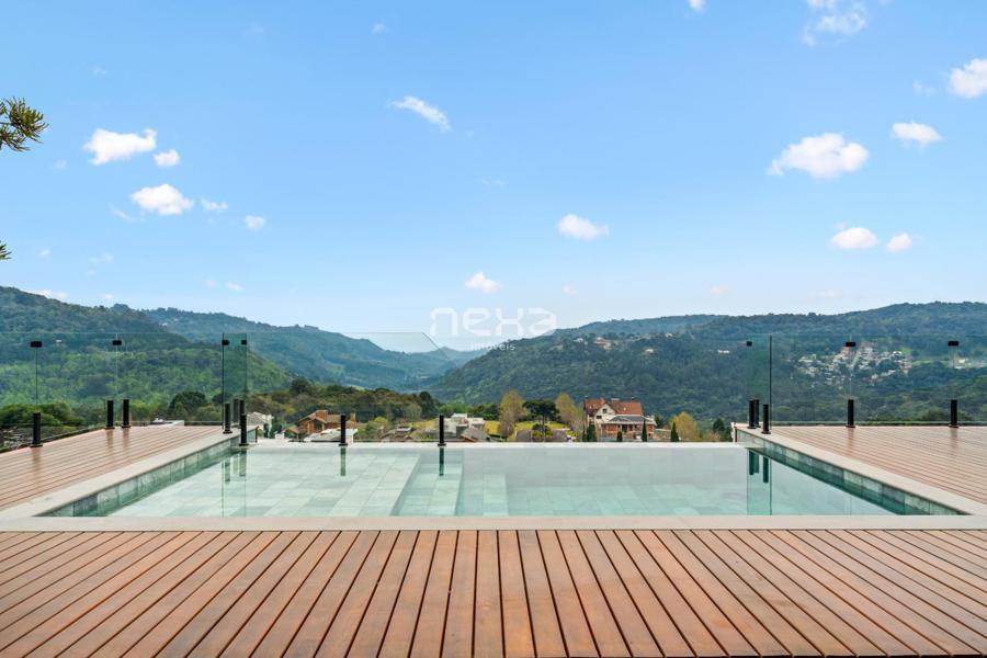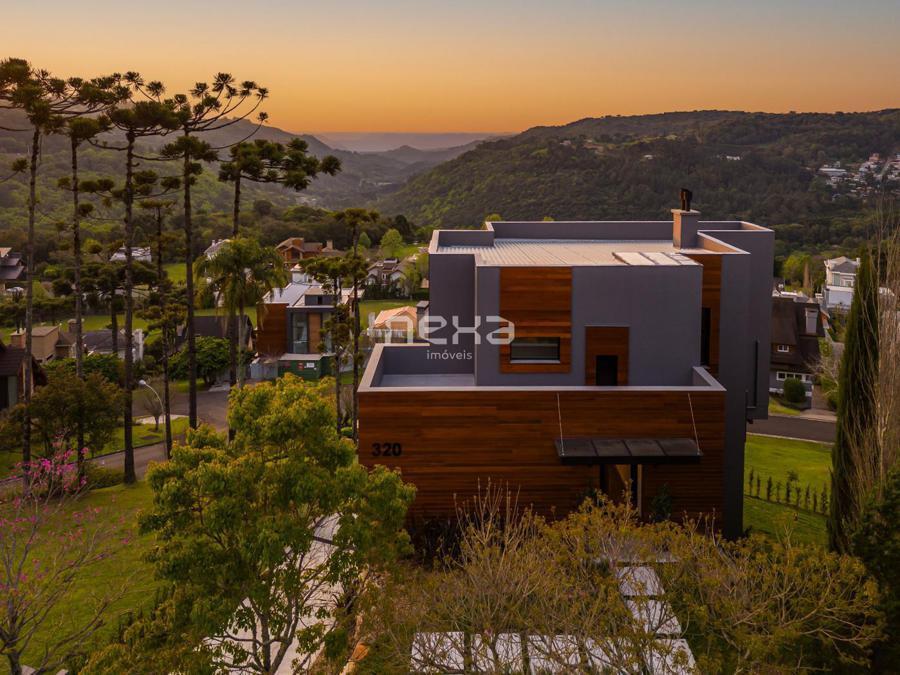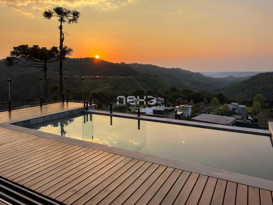 Residência no Alphaville, em Gramado, com quatro suítes, sendo uma no andar térreo e outras três no andar superior, com elevador já instalado, sala de jantar e estar, cozinha, lavabo, área de serviço, deck com piscina de borda infinita e garagem para 2 carros.