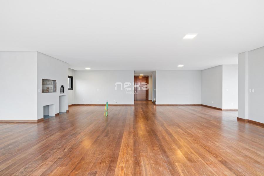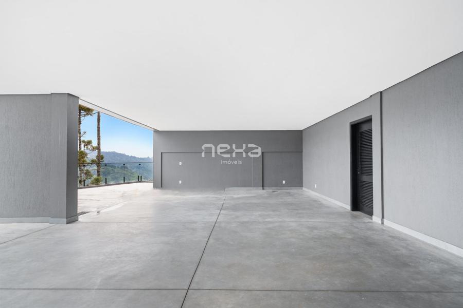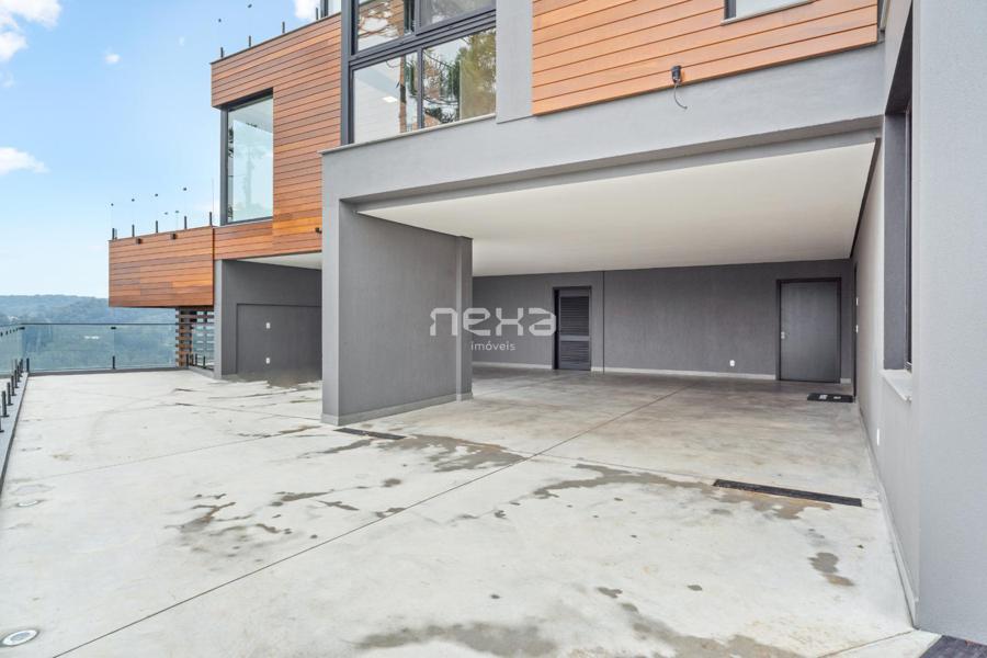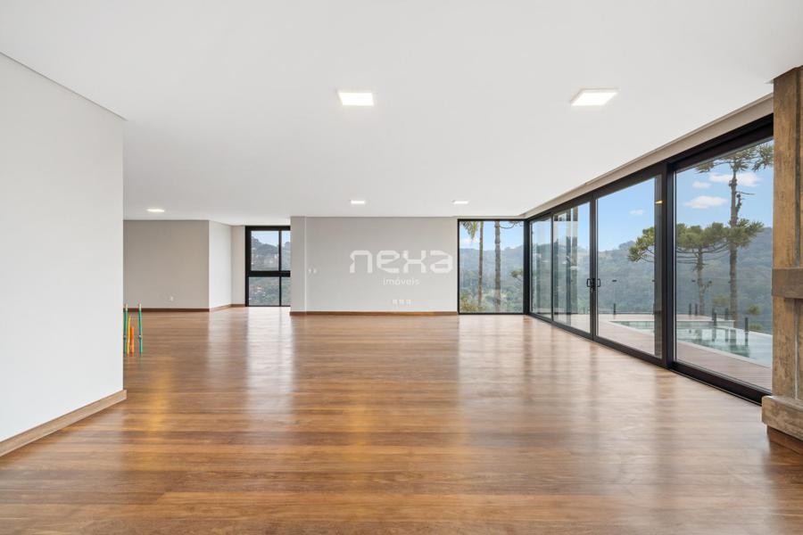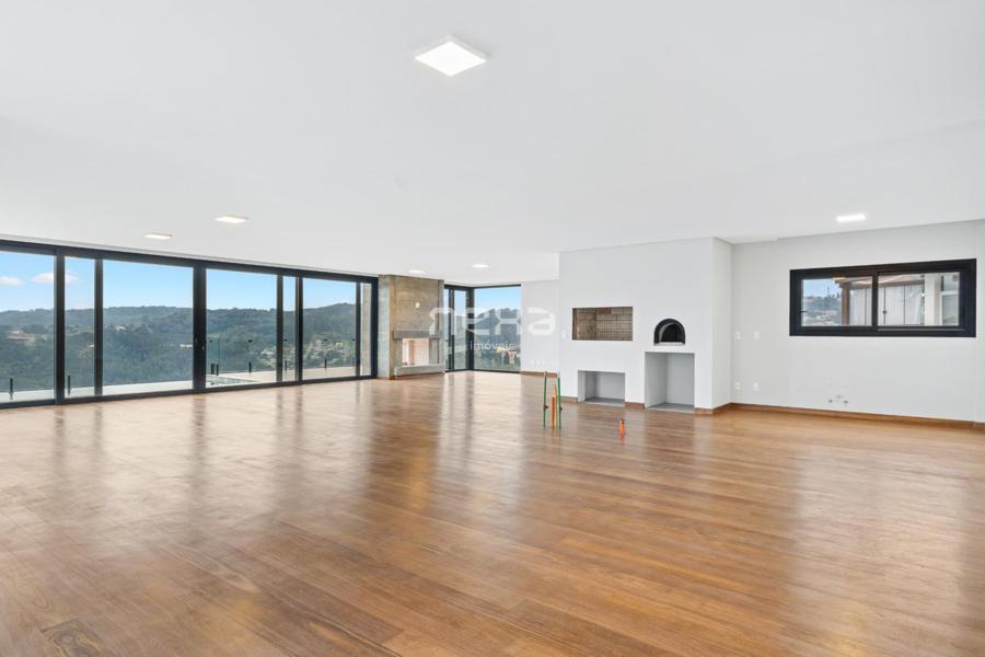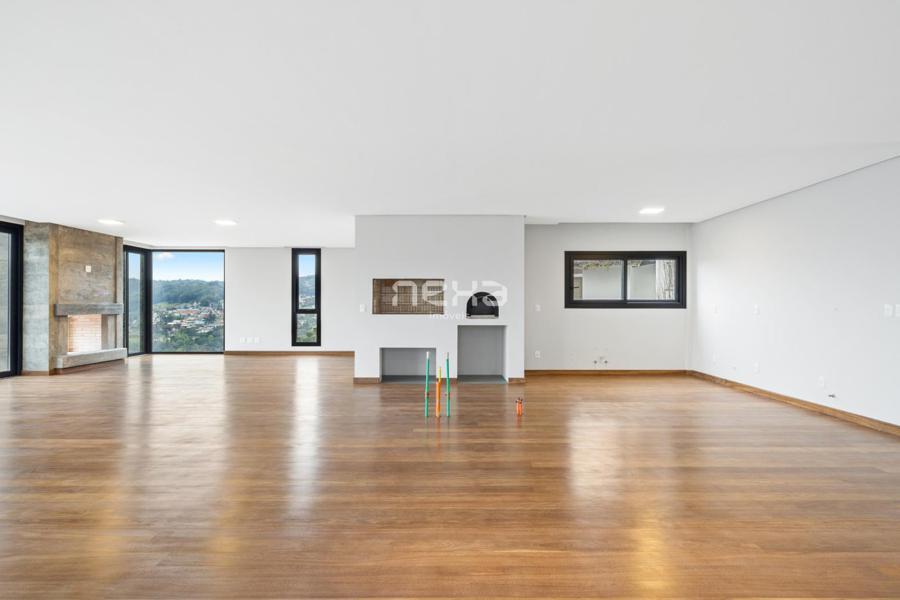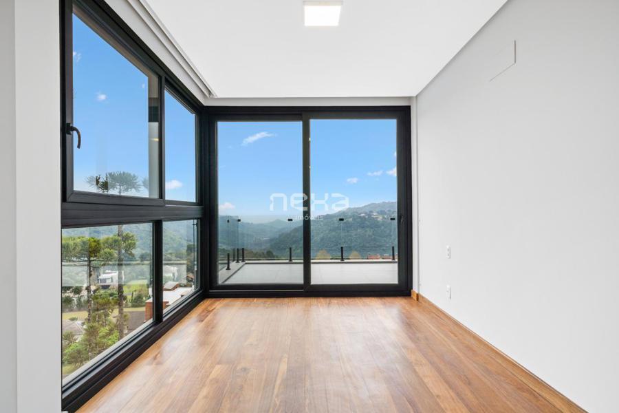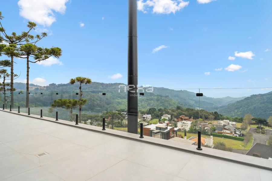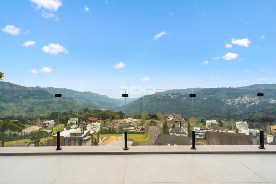 Residência no Alphaville, em Gramado, com quatro suítes, sendo uma no andar térreo e outras três no andar superior, com elevador já instalado, sala de jantar e estar, cozinha, lavabo, área de serviço, deck com piscina de borda infinita e garagem para 2 carros.